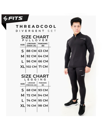 FITS Threadcool Divergent Sport Pullover Jacket adalah produk jaket sport pria berwarna hitam yang memiliki zip penuh, sehingga dapat disesuaikan dengan suhu tubuh. FITS Threadcool Divergent Sport Pullover Jacket berbahan 90% polyester dan 10% spandex dengan empat varian ukuran, yaitu S (88 cm x 63 cm), M (92 cm x 64 cm), L (96 cm x 66 cm), dan XL (102 cm x 71 cm). FITS Threadcool Divergent Sport Pullover Jacket nyaman digunakan saat berolahraga karena kain polyesternya mampu menjaga kelembaban kulit, mengering dengan cepat, lembut saat disentuh, dan memiliki sirkulasi udara yang baik.