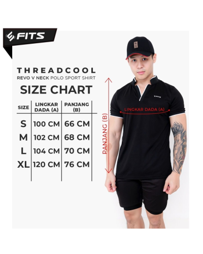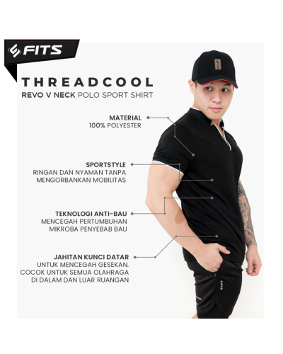 FITS Threadcool Revo V Neck Polo Sport shirt adalah produk kaos olahraga pria yang berbentuk V pada bagian leher. FITS Threadcool Revo V Neck Polo Sport shirt terbuat dari 100% bahan polyester dan memiliki 4 ukuran, yakni S (100cm X 68cm), M (102cm X 66 cm), L (104cm X 70cm) dan XL (120cm X 76cm). Produk ini tersedia dalam 2 warna, navy dan hitam, warna yang cocok dipadupadankan dengan berbagai macam sport style.