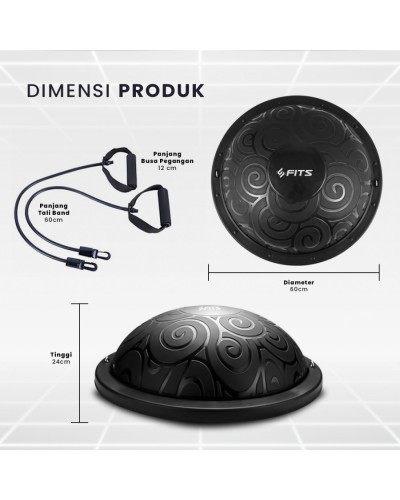 FITS Balance Bosu Ball memiliki Diameter 60cm, tinggi ball setelah di pompa 24cm dilengkapi dengan resistance band dengan panjang busa pegangan resistance band 12cm dan panjang resistance band 60cm serta dilengkapi dengan pompa udara dapat membantu Anda menyesuaikan tahanan sesuai keinginan.