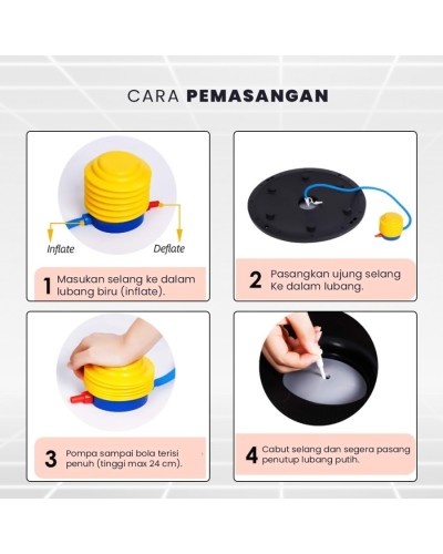 - Dimensions : Diameter: 60cm tinggi ball setelah di pompa : 24cm panjang busa pegangan resistance band : 12cm panjang resistance band : 60cm