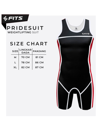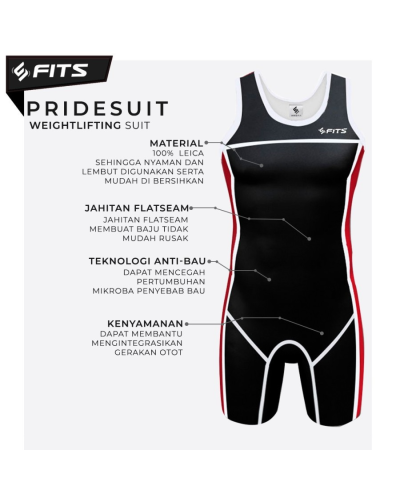 FITS Pridesuit Weightlifting Suit adalah produk baju singlet untuk olahraga angkat beban berwarna hitam dengan jahitan Flatsean, sehingga lebih awet dan tahan lama. FITS Pridesuit Weightlifting Suit berbahan 100% Leica yang tersedia dalam 3 ukuran, yaitu M (70 cm x 81 cm), L (78 cm x 86 cm), dan XL (82 cm x 87 cm). FITS Pridesuit Weightlifting Suit didesain mampu mengompresi seluruh tubuh, sehingga membantu mengintegrasikan gerakan otot dan mencegah kelelahan.