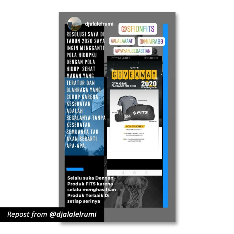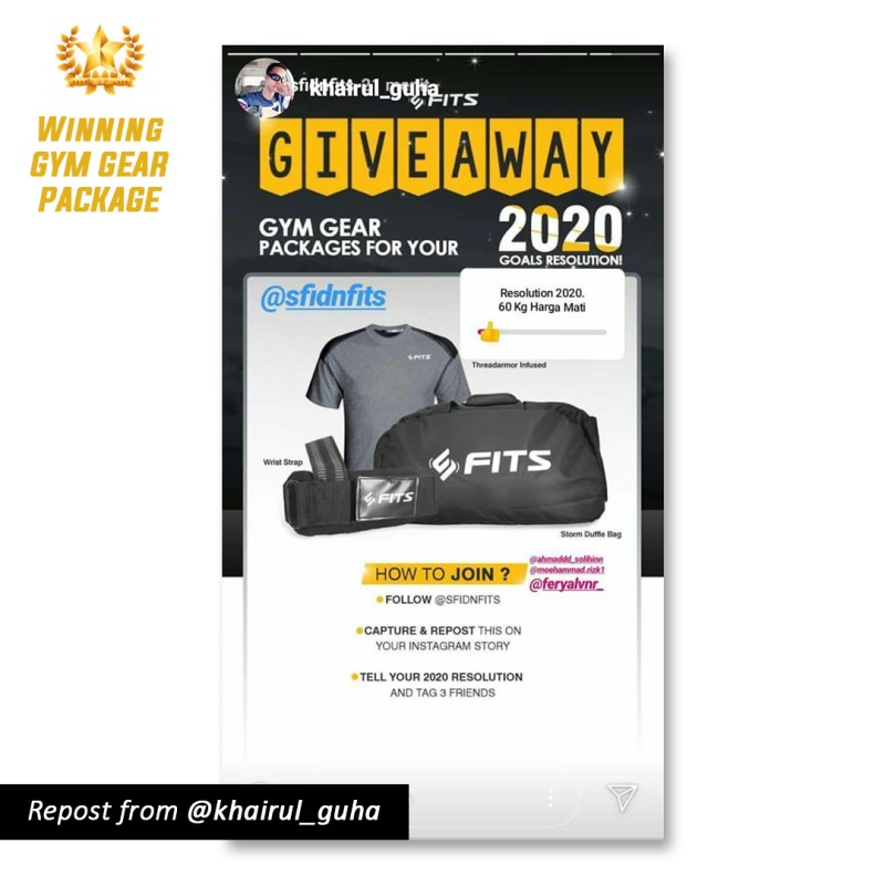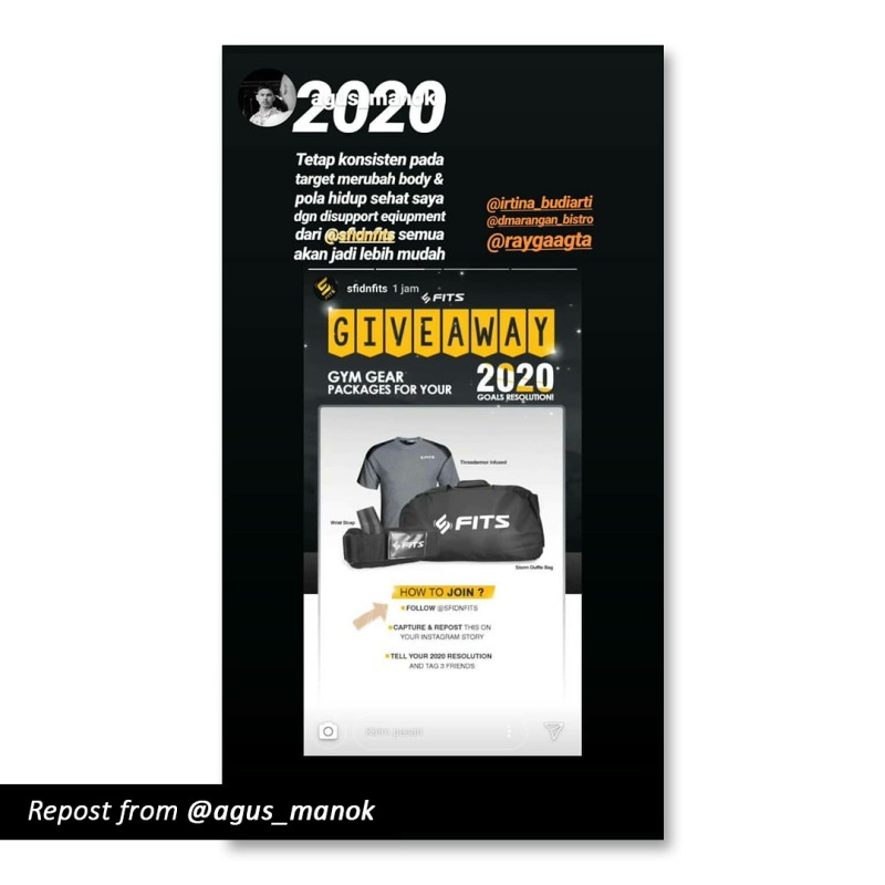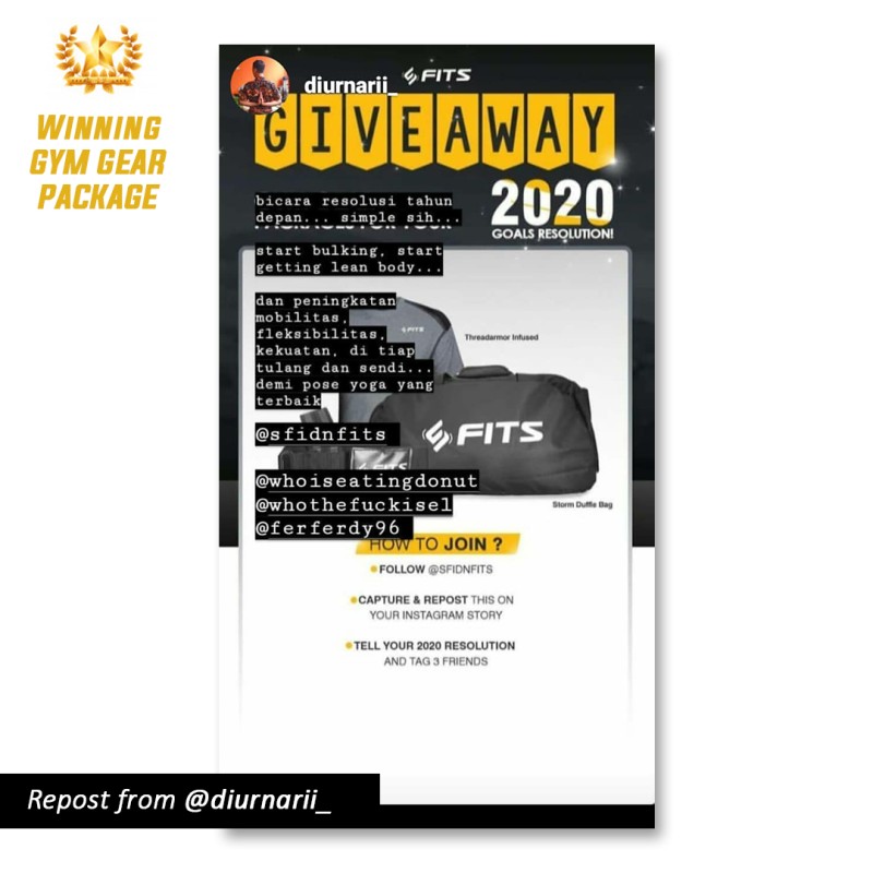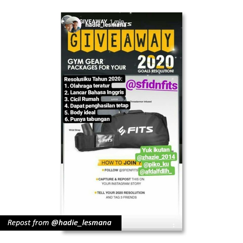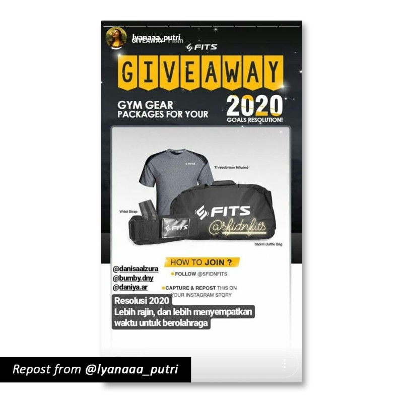- Deskripsi event :Dapatkan aksesoris gym GRATIS untuk menemanimu berjuang mencapai body goals di tahun 2020! Yuk ikutan giveaway ini dan dapatkan GYM GEAR Packages Original FITS.