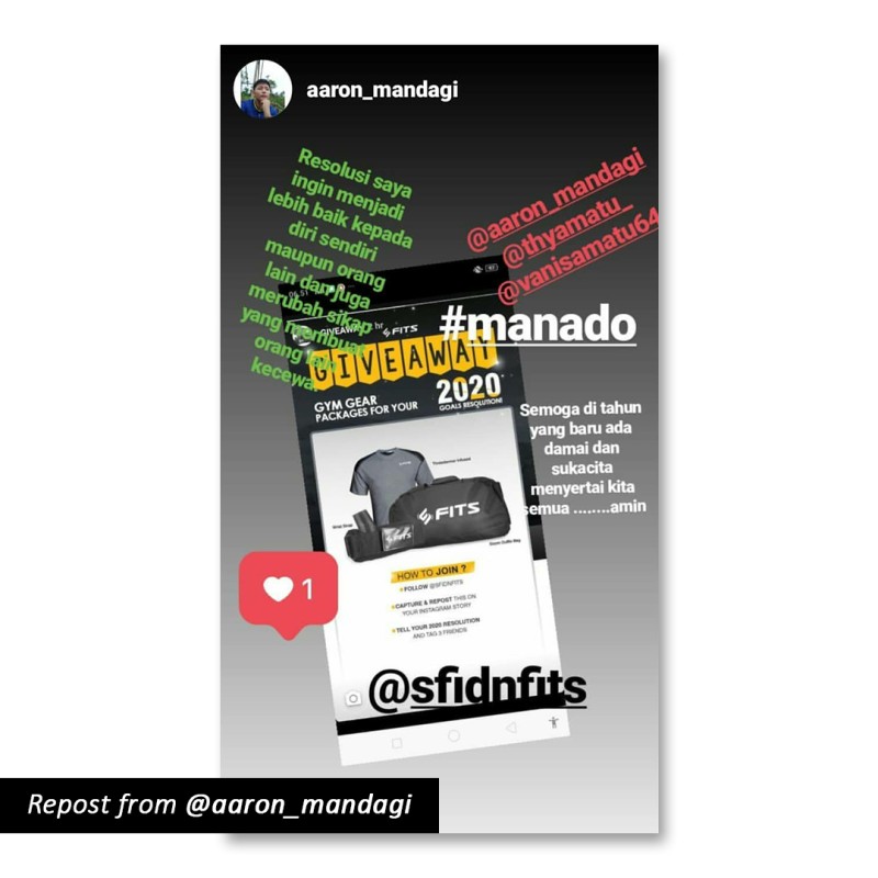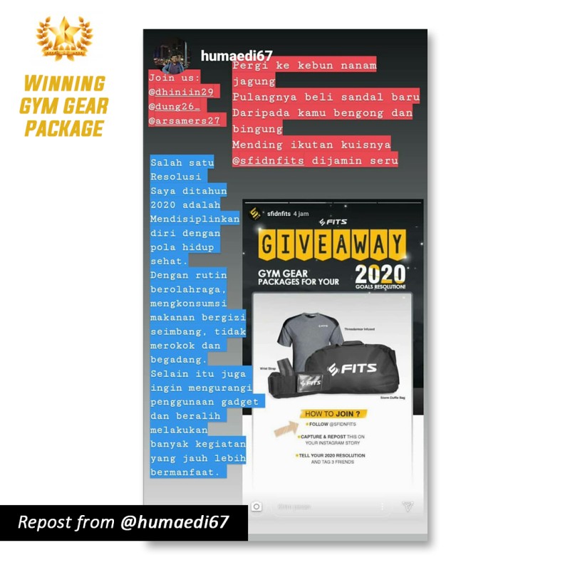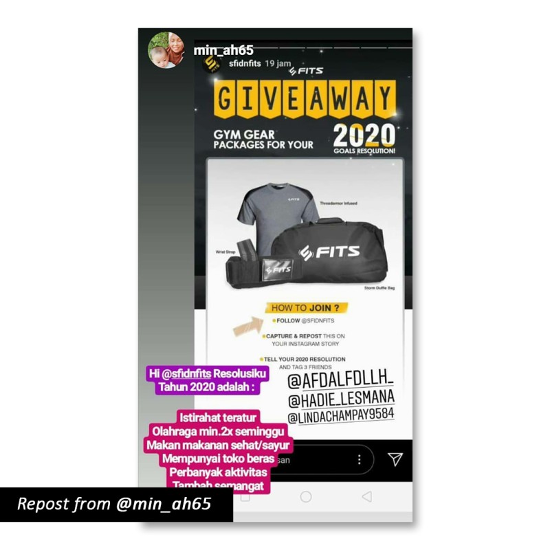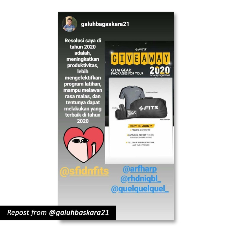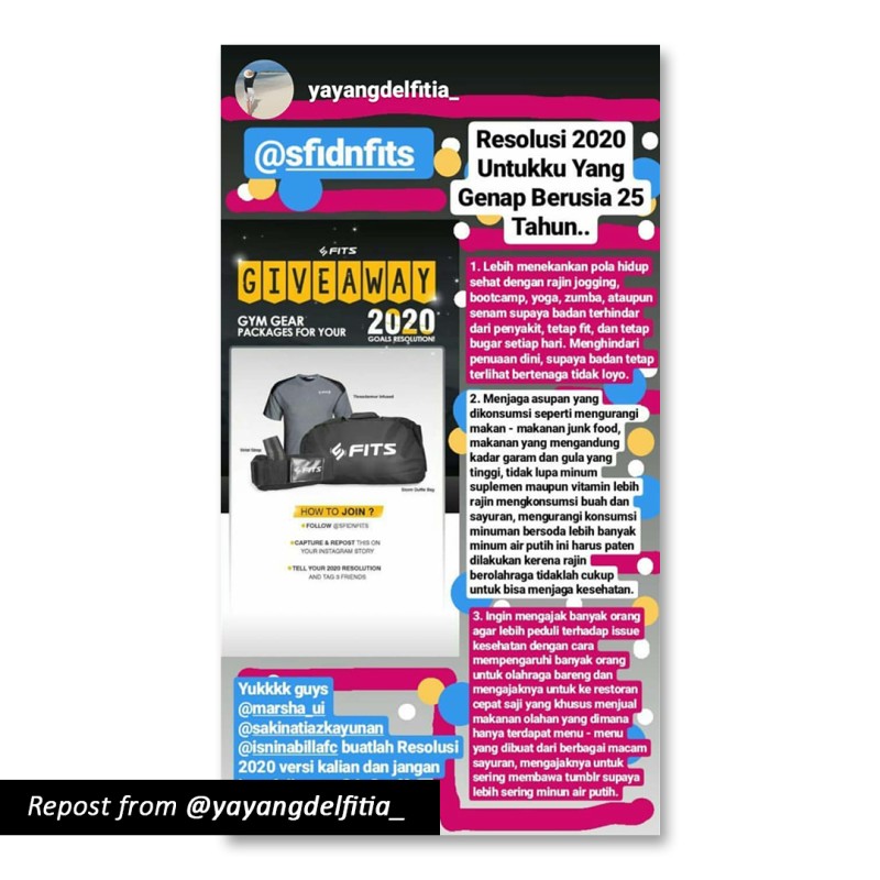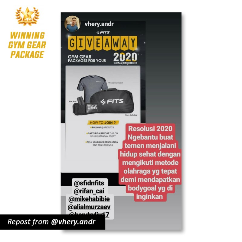 - Deskripsi event :Dapatkan aksesoris gym GRATIS untuk menemanimu berjuang mencapai body goals di tahun 2020! Yuk ikutan giveaway ini dan dapatkan GYM GEAR Packages Original FITS.