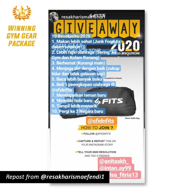 5 resolusi paling menginspirasi akan terpilih menjadi pemenang yang akan diumumkan di Instagram @sfidnfits pada tanggal 9 Januari 2020. Yuk mulai tularkan resolusimu dan dapatkan Gym Gear Packages dari FITS! #fitsers