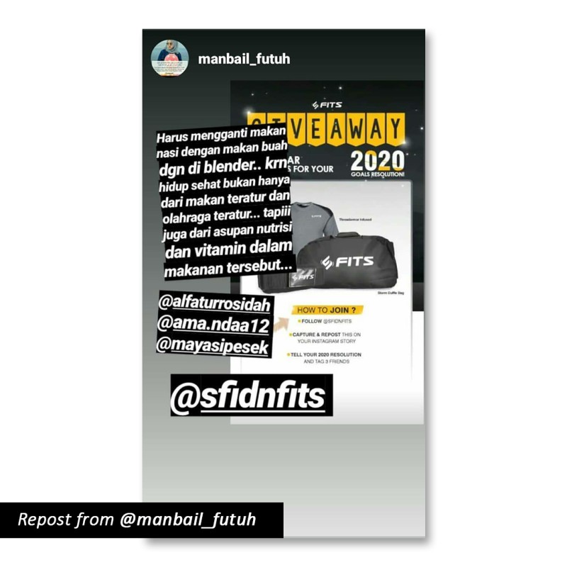 SFIDNFITS GIVEAWAY DESEMBER 2019 adalah program terbaru SFIDNFITS.COM yang 100% GRATIS tanpa dipungut biaya, bisa diikuti oleh semua kalangan, sangat mudah diikuti.