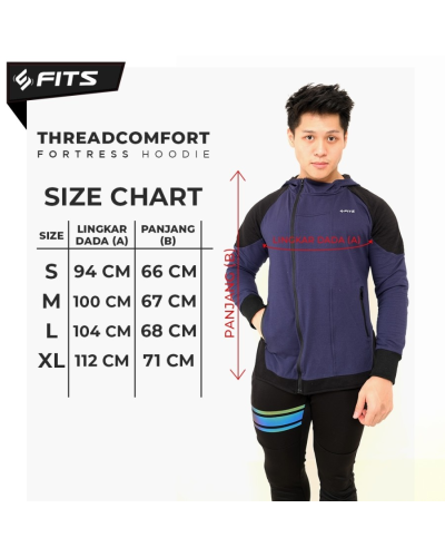 Fits Threadcomfort Fortress Hoodie Jacket Pullover adalah produk jaket olahraga yang terbuat dari bahan cotton yang lembut dan nyaman saat digunakan. Fits Threadcomfort Fortress Hoodie Jacket Pullover tersedia dalam 2 warna, navy dan hitam serta memiliki ukuran S (94 cm X 66 cm), M (100 cm X 67 cm), L (104 cm X 68 cm) dan XL (112 cm X 71 cm).
